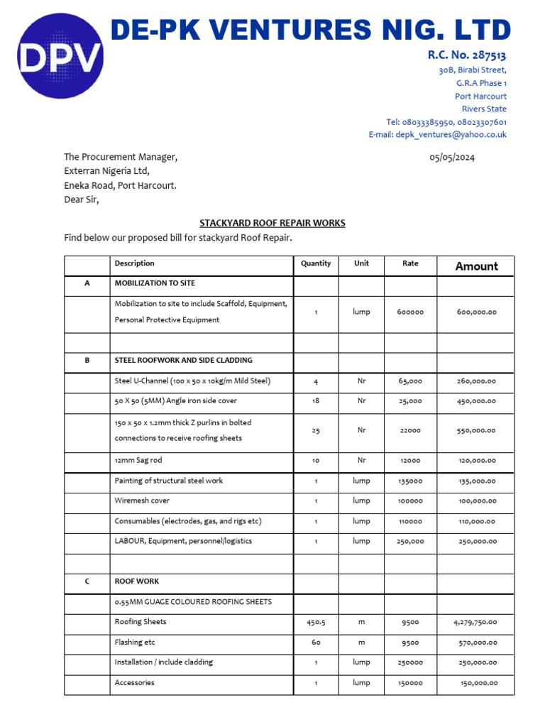 Find below our proposed bill for stackyard Roof Repair.