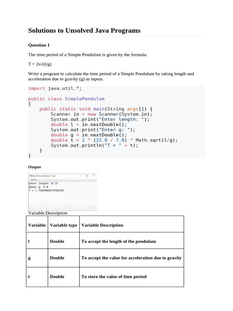 double t = 2 * (22.0 / 7.0) * Math.sqrt(l/g);