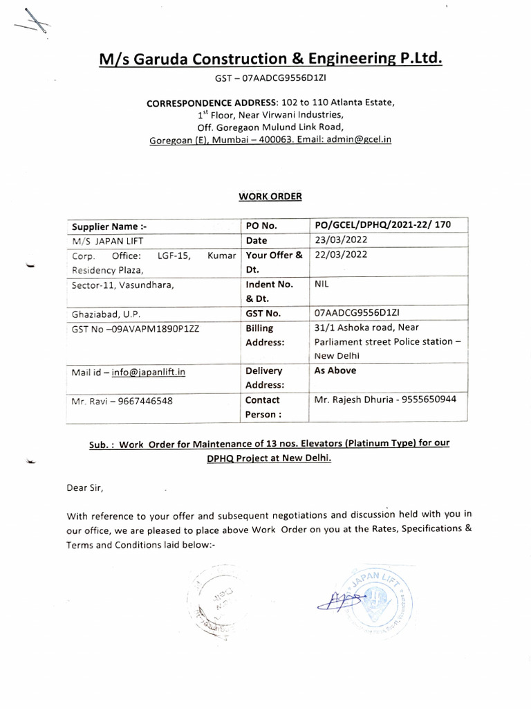 Hafe a FR AT JTATI Please refer above mentioned work and work order, the contract