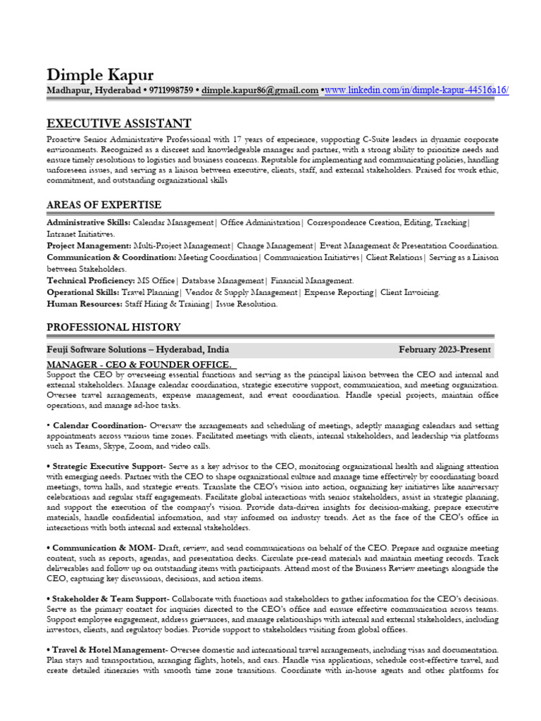 Proactive Senior Administrative Professional with 17 years of experience, supporting C-Suite leaders in dynamic corporate