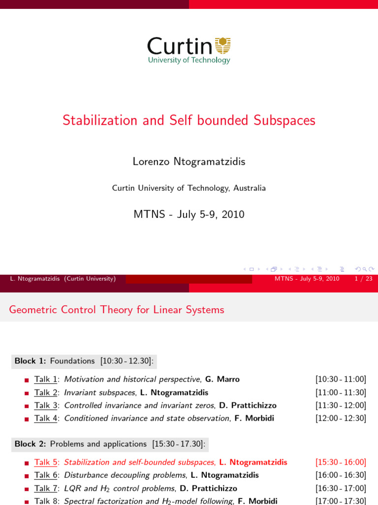 Talk 3: Controlled invariance and invariant zeros, D. Prattichizzo [11:30 - 12:00]