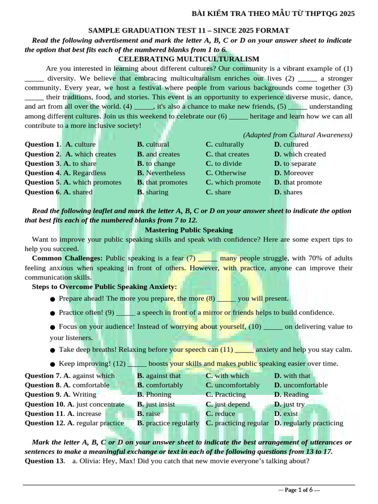 Question 1. A. culture B. cultural C. culturally D. cultured