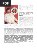 Emilio F. Aguinaldo - (1869 - 1964) Siya ang Pangulo ng unang Republika ng Pilipinas. Isinilang siya noong March 22, 1869 sa Kawit, Cavite. Siya ay ika-pito sa walong anak nina Carlos Aguinaldo at Trinidad Famy. Nag-aral ito sa mga pribadong paaralan sa kanilang lugar at pinagpatuloy sa Colegei de San Juan de Letran sa Maynila. Naging Gobernadorcillo ng Kawit,Cavite ang kanyang ama at ang kanyang mas nakakatandang kapatid na si Crispulo. Cabesa de Barangay ng Binakayan, Cavite naman siya sa loob ng walong taon at nagging Capitan Municipal din siya ng Kawit. 1896 ikinasal siya kay Niaria del Rosario may limang anak, tatlong babae at dalawang lalaki. Nang siya'y mabiyudo, napangasawa niya si Maria Agoncillo noong 1921. 1894 sumapi si Aguinaldo at si Santiago Alvarez sa Noveleta, Cavita kasama din ang pinsang si Baldomero Aguinaldo sa KKK, lihim silang nagpapalaganap ng kilusan sa Cavite. Nagtayo sila ng Chapter sa Cavite ito ay ang grupong Magdalo. August 31, 1896 nagrebolusyon ang grupo ni Aguinaldo sa kawit, Cavite pagkatapos ng "Unang Sigaw sa Pugadlawin". Rebolusyonaryong Gobyerno ang itinatag ng mga Pilipino noong March 22,1897 at si Aguinaldo ang Presidente. Nakasentro sa Cavite ang pamahalaan ni Aguinaldo ngunit napilitang ilipat ito sa Biak na Bato, Bulubundukin ng Bulacan dahil sa bakbakan ng puwersa ni Aguinaldo at ng mga sundalong kastila. December 14, 1897 nagkaron ng kasunduan sa Biak na Bato. Ang kasunduan na ito ng kastila at ng Pilipinas ay matigil na ang labanan(tigil-putukan), nangako ang mga dayuhan na magkaron ng pagbabago sa gobyerno, papaalisin ang mga prayle at mapang-abusong mga opisyales. Si Aguinaldo at ang ilang piling tauhan sa Hong Kong ang kapalit. Ngunit hindi nasunod ang kasunduang ito dahil sa paglabag ng magkabilang panig(hindi isinuko ng mga Pilipino ang lahat ng kanilang mga armas, sa halip ay ipinambili pa ang perang nakuha ng maraming armas. Hinuli naman ng mga kastila ang mga Pilipinong nagsuko ng kanilang mga baril.) Muling nagbalik si Aguinaldo sa Pilipinas kasama ang mga Amerikano, sila ang ang tumolong sa pag laban sa mga kastila. Hindi nagtagal muling nasakop ni Aguinaldo ang mga lalawigan maliban sa Maynila. Hunyo 12, 1898 itinatag ang unang Pamahalaan sa lalawigan ng Bacoor, Cavite. Dito unang iwinagayway ang bandila ng Pilipinas at unang narinig ang Pambansang Awit ng Pilipinas. August 13,1898 sumuko ang Kastila sa mga Amerikano at inilipat ang pamahalaan sa Malolos, Bulakan at dito ipinahayag ang Republika ng Pilipinas, January 23, 1899 naging Pangulo si Emilio Aguinaldo. February 6,1964 namatay si Emilio Aguinaldo.
