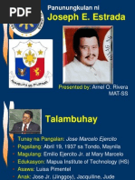 Joseph Ejercito Estrada- Third President of the Fifth Republic from June 30,1998- January 20 2001. Thirteenth President of tha Philippines. Siya ay nakilala sa buong Pilipinas sa tawag na "ERAP" nag umpisa ang kanyang pagsabak sa politika ng siya ay mahalal na Mayor ng San Juan, sa lugar ng Manila. Nang matapos ang EDSA Revolution, siya na nanalong isa sa mga senador ng Pilipinas at siya ay nahirang bilang ikalawang Pangulo ng Pilipinas noong 1992, siya ay naatasan ni Presidente Ramos na manguna sa pagsugpo sa Kriminalidad. Noong 1998 siya ay nahirang na Presidente ng Pilipinas sa pinakamataas na boto. Si Estrada ang nalatag ng pakikidigma sa mga rebeldeng muslim, pagsugpo sa kahirapan at sa corruption sa bansa. Siya naakusahan sa malawak na corruption o pagnanakaw sa kaban ng bayan. Siya ay tinanggalan ng katungkulan sa mababang kapulungan at siya ay naalis hanggang sa di natapos na paglilitis sa Senado. Noong January 2001 si Estrada ay natanggal bilang Presidente ng Pilipinas dahil sa pagtaboy sa kanya ng maraming tao at sa kawalan ng suporta ng hukbong sandatahan.