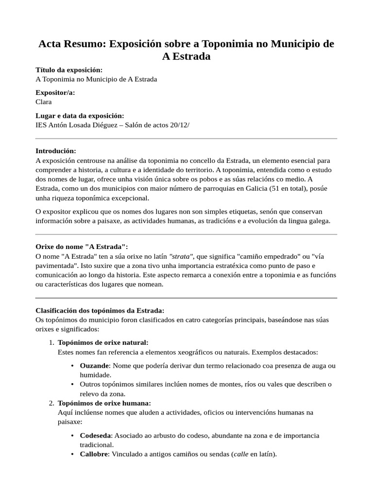 Acta Resumo: Exposición sobre a Toponimia no Municipio de