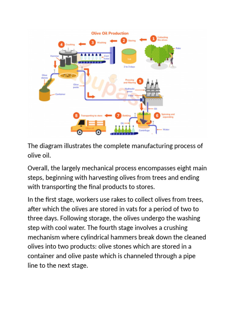 steps, beginning with harvesting olives from trees and ending