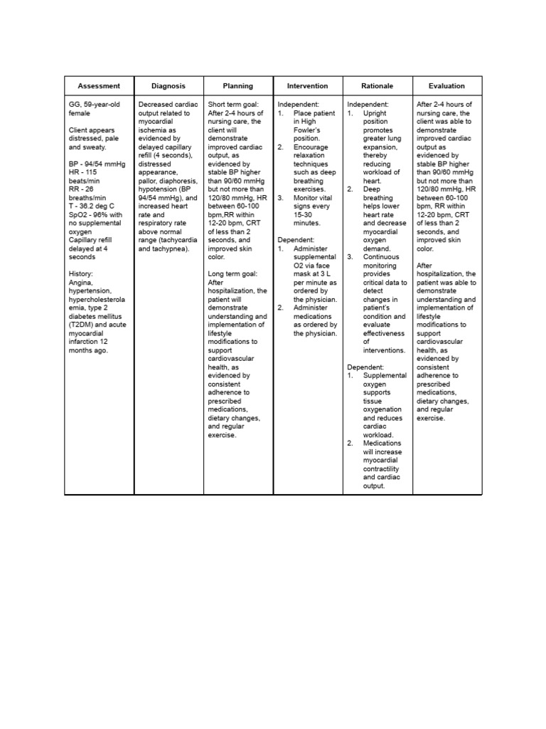 GG, 59-year-old Decreased cardiac Short term goal: Independent: Independent: After 2-4 hours of