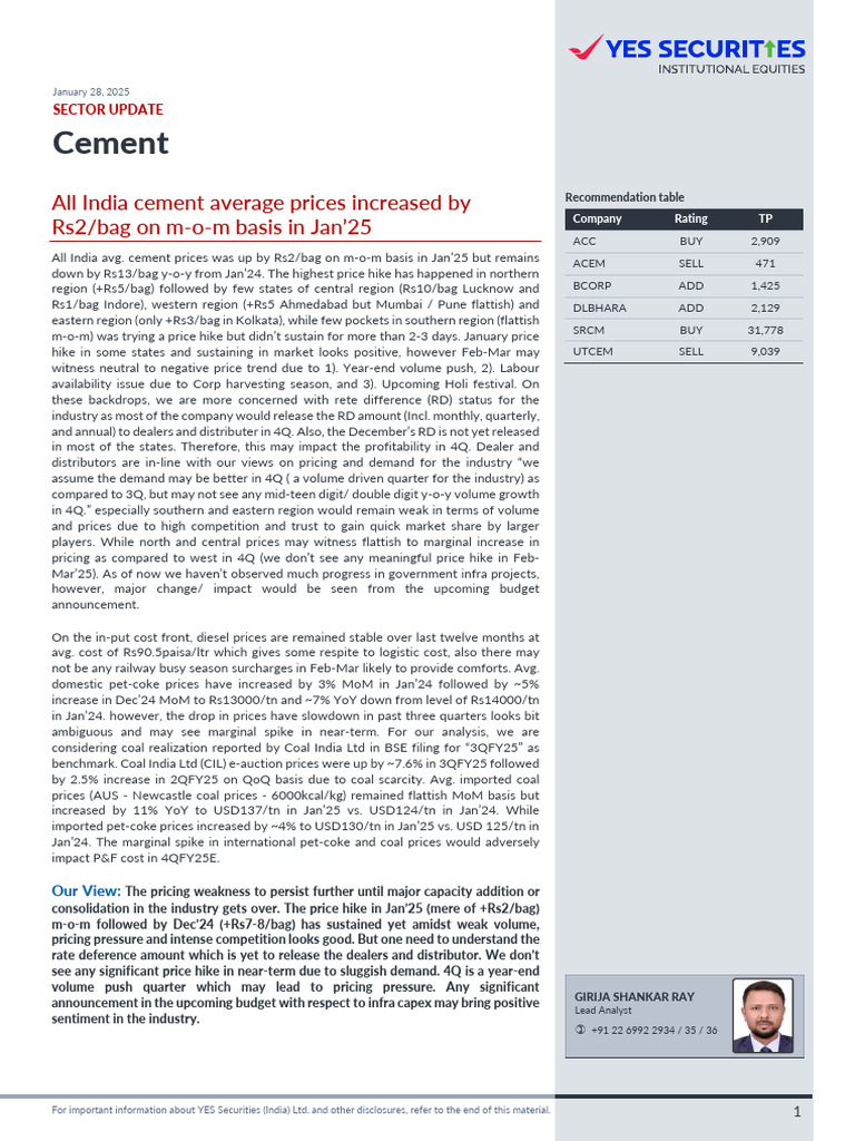 All India cement average prices increased by Recommendation table