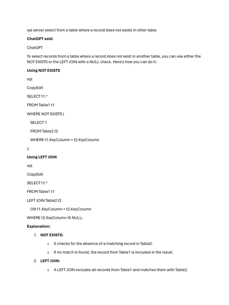 NOT EXISTS or the LEFT JOIN with a NULL check. Here's how you can do it: