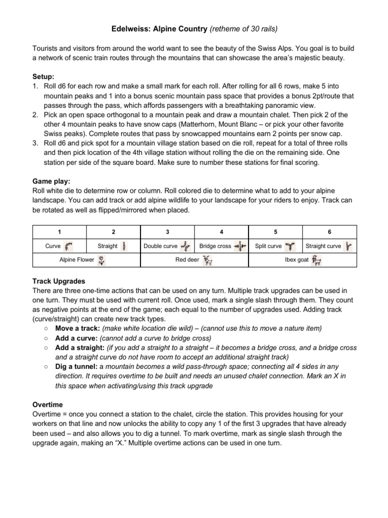 Roll white die to determine row or column. Roll colored die to determine what to add to your alpine