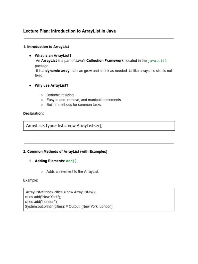 Lecture Plan: Introduction to ArrayList in Java