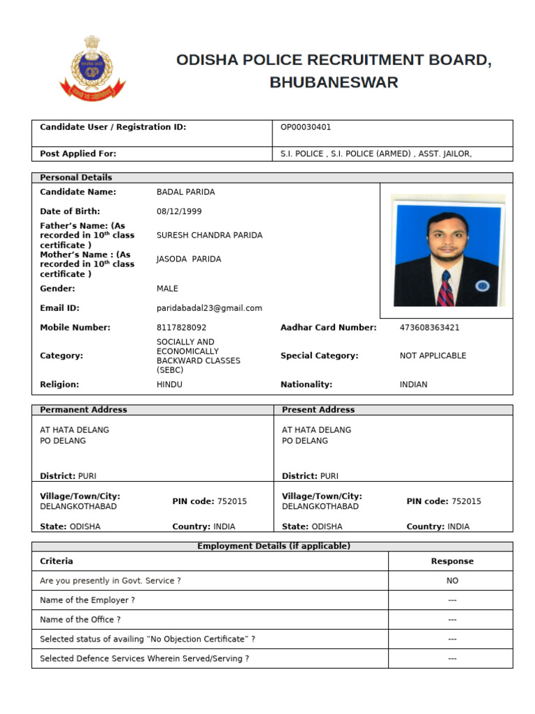 Post Applied For: S.I. POLICE , S.I. POLICE (ARMED) , ASST. JAILOR,