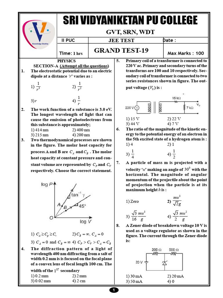 1. The electrostatic potential due to an electric transforms are 100 and 10 respectively. Sec-