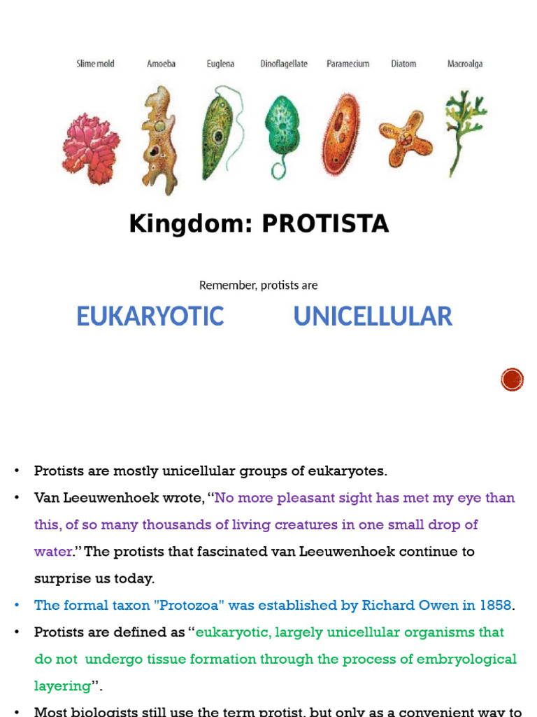 • Protists are defined as “eukaryotic, largely unicellular organisms that