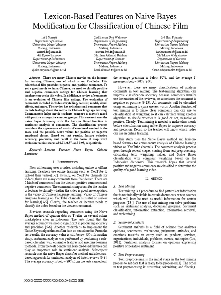 stemming, tokenizing, and filtering is carried out. Next, the method and lexicon-based features for film opinion sentiment