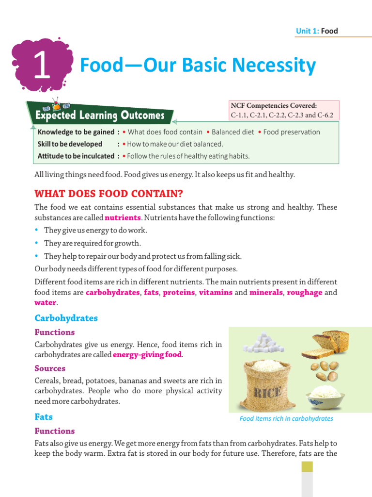 Knowledge to be gained : • What does food contain • Balanced diet • Food preserva on