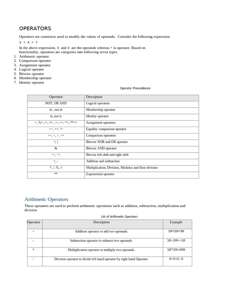 This operator is used to store right side operand in the left side operand. Table provides a list of