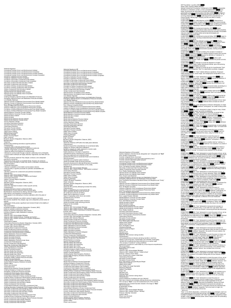 -Tertiary Containment Field Activated -Secondary Containment Field Integrity Restored *Assessment: The universe has been remade in the image of "God." Incident 0000-███-50: "God" attempted to transcend all concepts, to