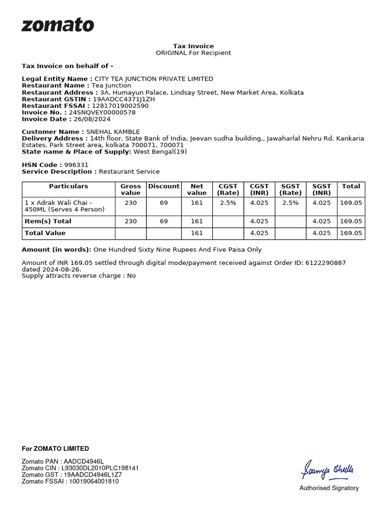 Zomato GST : 19AADCD4946L1Z7
