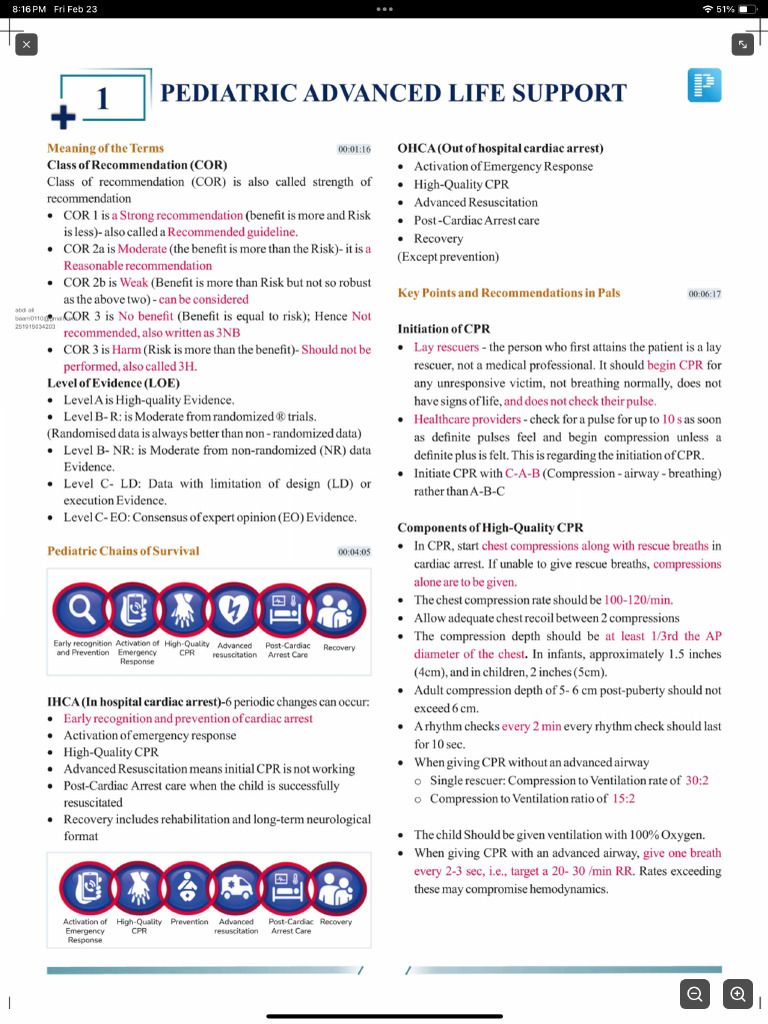 The document outlines the classifications of recommendations (COR) and levels of evidence (LOE) used in pediatric advanced life support, detailing the strength of recommendations from strong to not recommended. It describes the key components of high-quality CPR, advanced airway interventions, and drug administration during cardiac arrest, emphasizing the importance of proper techniques and monitoring. Additionally, it covers the management of various types of shock in children, including hypovolemic, cardiogenic, distributive, obstructive, and septic shock.
