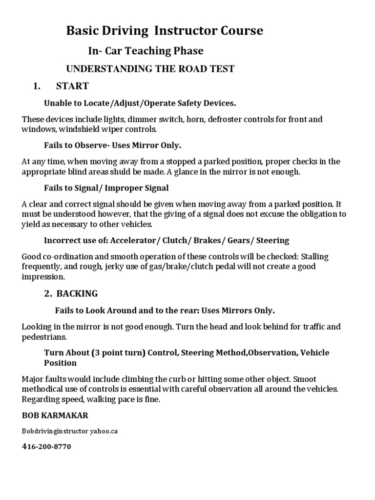 Fails to observe- Uses mirrors Only/backing/Leaving As with all other maneuvers, awareness of any possible or actual vehicle or pedestrian movements is essential, therefore careful observation around the car before and during any parking exercise is necessary. Disabilities involving the spine require the placing of extra mirrors giving on all around view. Hits: Objects/Other Vehicles or Climbs Curbs Adequate observation and good control of the vehicle is essential in all parking exercises. To be able to do any of the maneuvers three times in succession is a minimal standard to achieve, prior to keeping the test appointment. Fails to Signal When Leaving/Incorrect Signal The leaving of any parked position calls for a clear ad correct signal. Incorrect Use of Clutch/Brake/Accelerator/Gears/Steering The textbook ROADWORTHY suggests that You should aim to drive artfully. This implies, among other things, that pride should be taken in operating the controls with gentle precision and sympathetic understanding. BOB KARMAKAR
