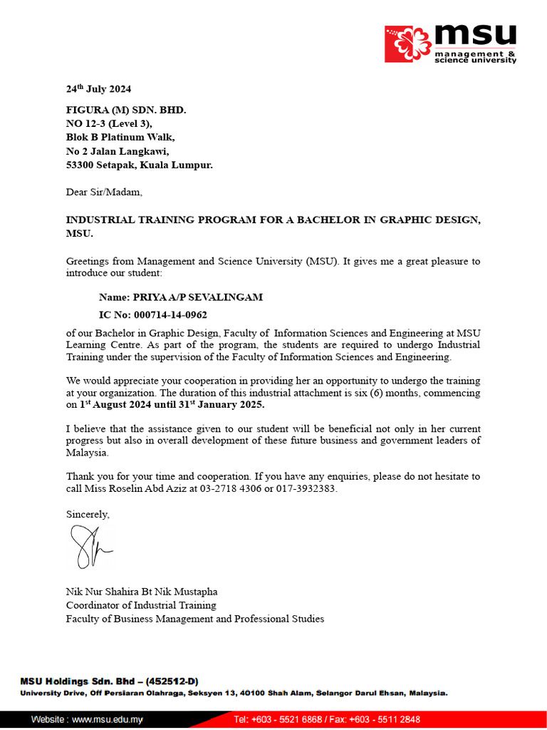 at your organization. The duration of this industrial attachment is six (6) months, commencing