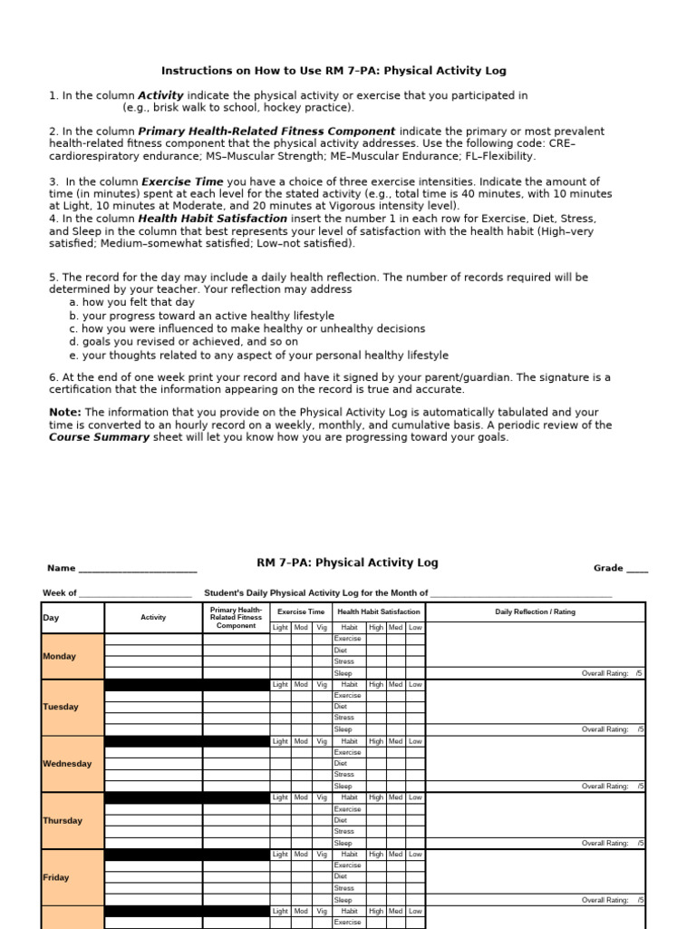 Name ___________________ RM 7–PA: Physical Activity Log Grade ___
