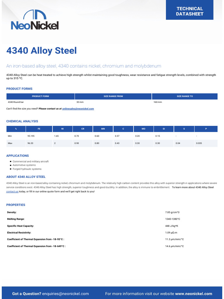 service conditions exist. 4340 Alloy Steel has high strength, superior toughness and good ductility. In addition, the alloy is immune to embrittlement. To learn more about 4340 Alloy Steel