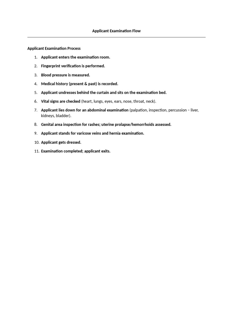 7. Applicant lies down for an abdominal examination (palpation, inspection, percussion – liver,
