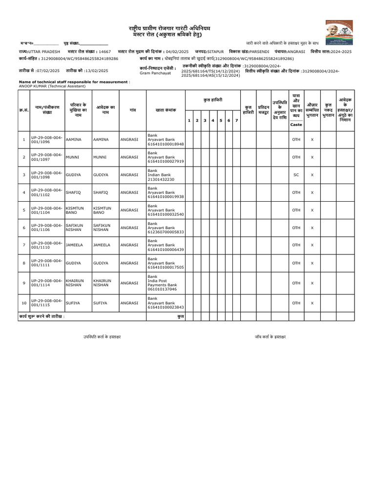 राज्य:UTTAR PRADESH मस्टर रोल संख्या : 14667 मस्टर रोल मुद्रण की दिनांक : 04/02/2025 जनपद:SITAPUR विकास खंड:PARSENDI पंचायत:ANGRASI वित्तीय साल:2024-2025