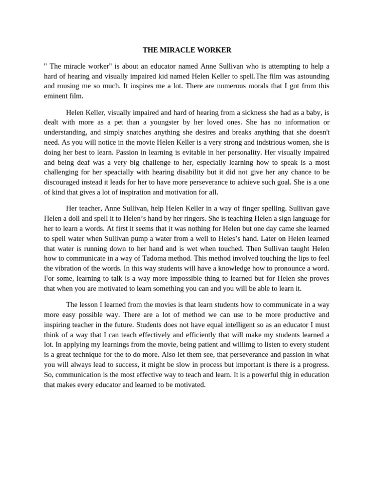 hard of hearing and visually impaired kid named Helen Keller to spell.The film was astounding
