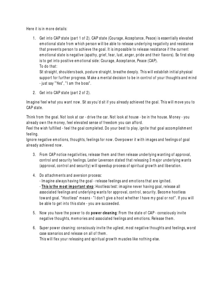 CAP state (Courage, Acceptance, Peace) is essentially elevated emotional state from which person will be able to release underlying negativity and resistance that prevents person to achieve the goal. It is impossible to release resistance if the current emotional state is negative (apathy, grief, fear, lust, anger, pride and their flavors). So first step is to get into positive emotional side: Courage, Acceptance, Peace (CAP). To do that: Sit straight, shoulders back, posture straight, breathe deeply. This will establish initial physical support for further progress. Make a mental decision to be in control of your thoughts and mind - just say "Yes", "I am the boss". 2. Get into CAP state (part 2 of 2). Imagine/feel what you want now. Sit as youd sit if you already achieved the goal. This will move you to CAP state. Think from the goal. Not look at car - drive the car. Not look at house - be in the house. Money - you already own the money, feel elevated sense of freedom you can afford. Feel the wish fulfilled - feel the goal completed. Do your best to play, ignite that goal accomplishment feeling. Ignore negative emotions, thoughts, feelings for now. Overpower it with images and feelings of goal already achieved now. 3. From CAP notice negativities, release them and then release underlying wanting of approval, control and security feelings. Lester Levenson stated that releasing 3 major underlying wants (approval, control and security) will speedup process of spiritual growth and liberation. 4. Do attachments and aversion process: - Imagine always having the goal - release feelings and emotions that are ignited. - This is the most important step: Hootless test: imagine never having goal, release all associated feelings and underlying wants for approval, control, security. Become hootless toward goal. "Hootless" means - "I don't give a hoot whether I have my goal or not". If you will be able to get into this state - you are succeeded. 5. Now you have the power to do power cleaning: From the state of CAP - consciously invite negative thoughts, memories and associated feelings and emotions. Release them. 6. Super power cleaning: consciously invite the ugliest, most negative thoughts and feelings, worst case scenarios and release on all of them. This will flex your releasing and spiritual growth muscles like nothing else.
