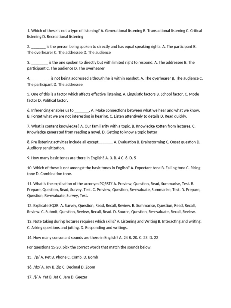 1. Which of these is not a type of listening? A. Generational listening B. Transactional listening C.