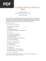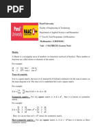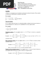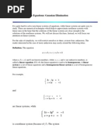 The above process is called Gaussian elimination (GE, hereafter) & this equation is in upper triangular form, Can be solved (systematically) by back-substitution. From (3b) we have x3 = 0 Thus from (2a) x2 + 7 0 = 1 x2 = 1 & from (1) 2x1 + 3(1) 2(0) = 1 x1 = 1 Now, think of this equation in a (slightly) dierent way: The array of numbers which are the coecients of x1, x2, x3 is 2 3 2 4 7 3 6 3 2 is called the matrix of coecients for our system, usually written as 2 3 2 A=4 7 3 6 3 2 (the numbers in the matrix are called elements) & the RHS is 1 the column 3 , 3 which we usually write as 1 b = 3 (a column vector/matrix) 3