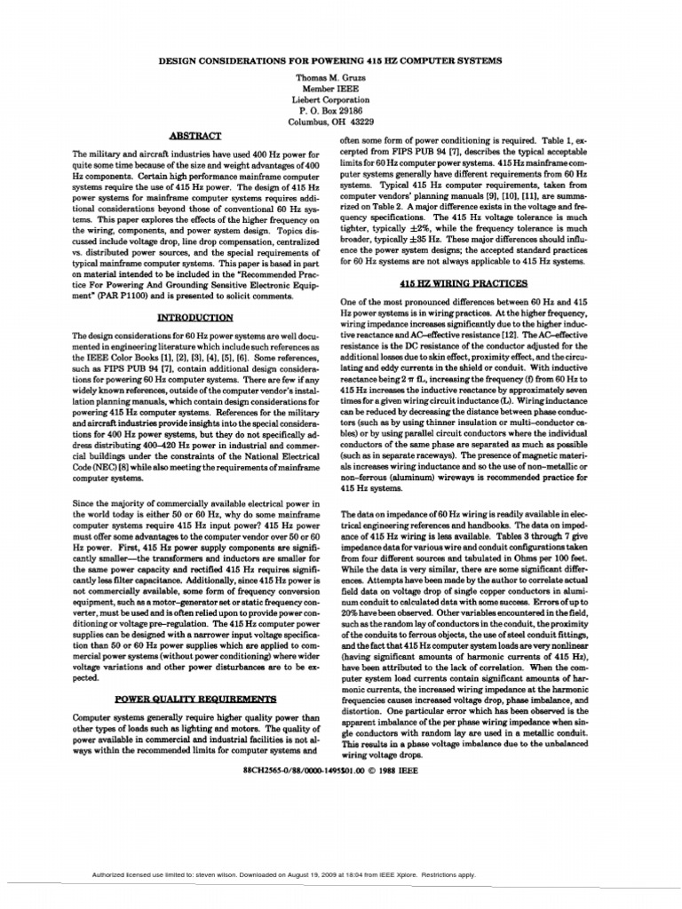 The design considerations for 60 H z power systems are well documented in engineering literature which include such references as the IEEE Color Books 111, 1 1 1 1 [41, [61.Some references, 2 , 3 , [51, such as FIPS PUB 94 [7],contain additional design considerations for powering 60 H z computer systems. There are few if any widely known references, outside of the computer vendor's installation planning manuals, which contain design considerations for powering 415 H z computer systems. References for the military and aircraft industries provide insights into the special considerations for 400 H z power systems, but they do not specifically address distributing 400-420 H z power in industrial and commercial buildings under the constraints of the National Electrical while also meeting the requirements of mainframe Code (NEC) [8] computer systems. Since the majority of commercially available electrical power in the world today is either 50 or 60 Hz, why do some mainframe computer systems require 415 H z input power? 415 Hz power must offer some advantages to the computer vendor over 50 or 60 H power. First, 415 Hz power supply components are signifiz cantly smaller-the transformers and inductors are smaller for the same power capacity and rectified 415 Hz requires significantly less filter capacitance. Additionally, since 415 H z power is not commercially available, some form of frequency conversion equipment, such as a motor-generator set or static frequency converter, must be used and is often relied upon to provide power conditioning or voltage pre-regulation. The 415 H z computer power supplies can be designed with a narrower input voltage specification than 50 or 60 H z power supplies which are applied to commercial power systems (without power conditioning) where wider voltage variations and other power disturbances are to be expected.