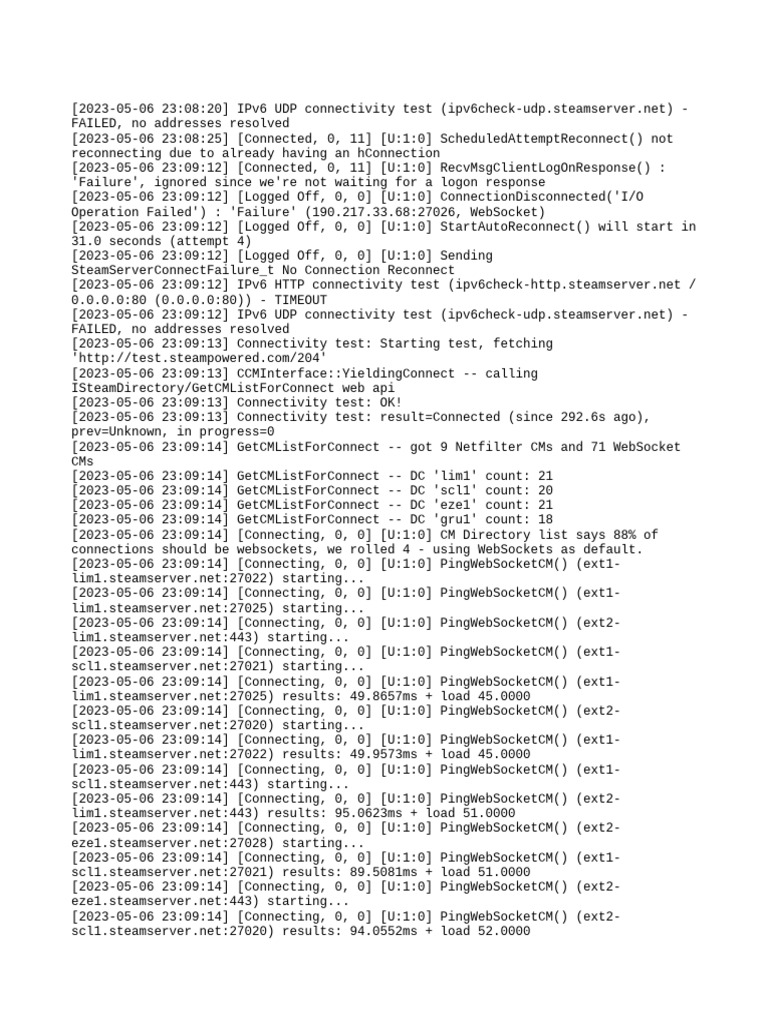 [2023-05-06 23:09:15] [Connecting, 0, 15] [U:1:0] Client thinks it can connect via:
