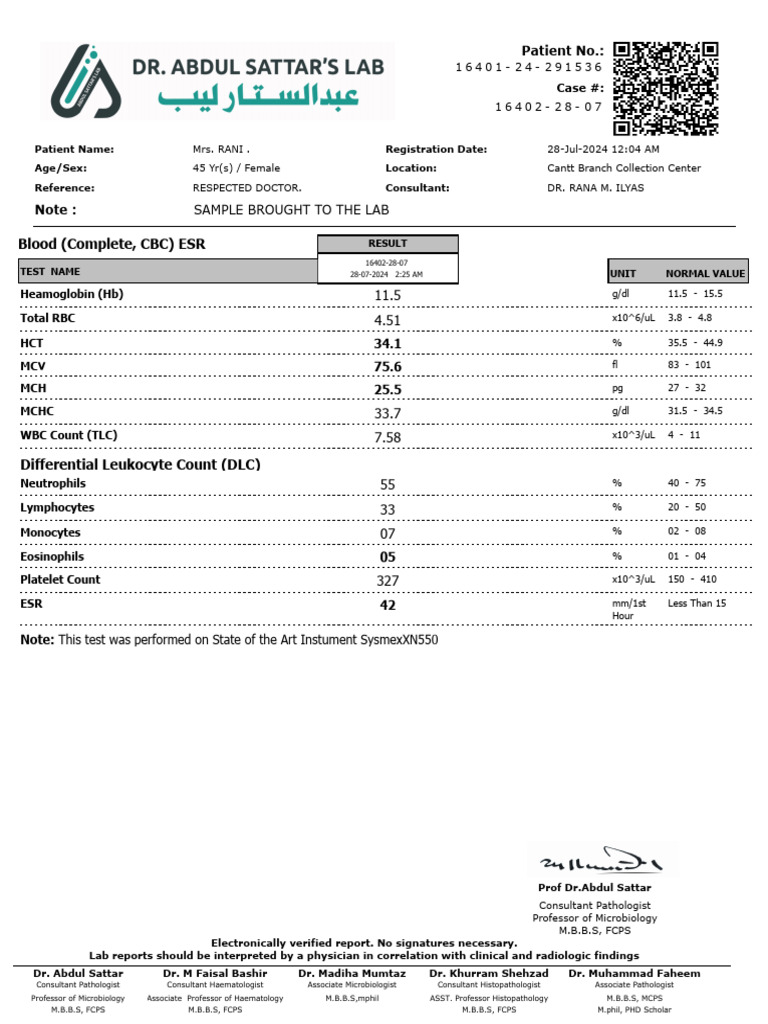 Age/Sex: 45 Yr(s) / Female Location: Cantt Branch Collection Center