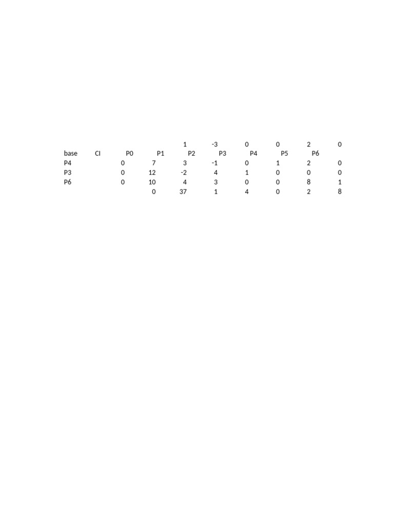 The document presents a matrix with various parameters labeled as base, CI, and P0 to P6. It includes numerical values associated with different variables P3, P4, and P6. The data appears to be organized for analysis, likely in a mathematical or statistical context.