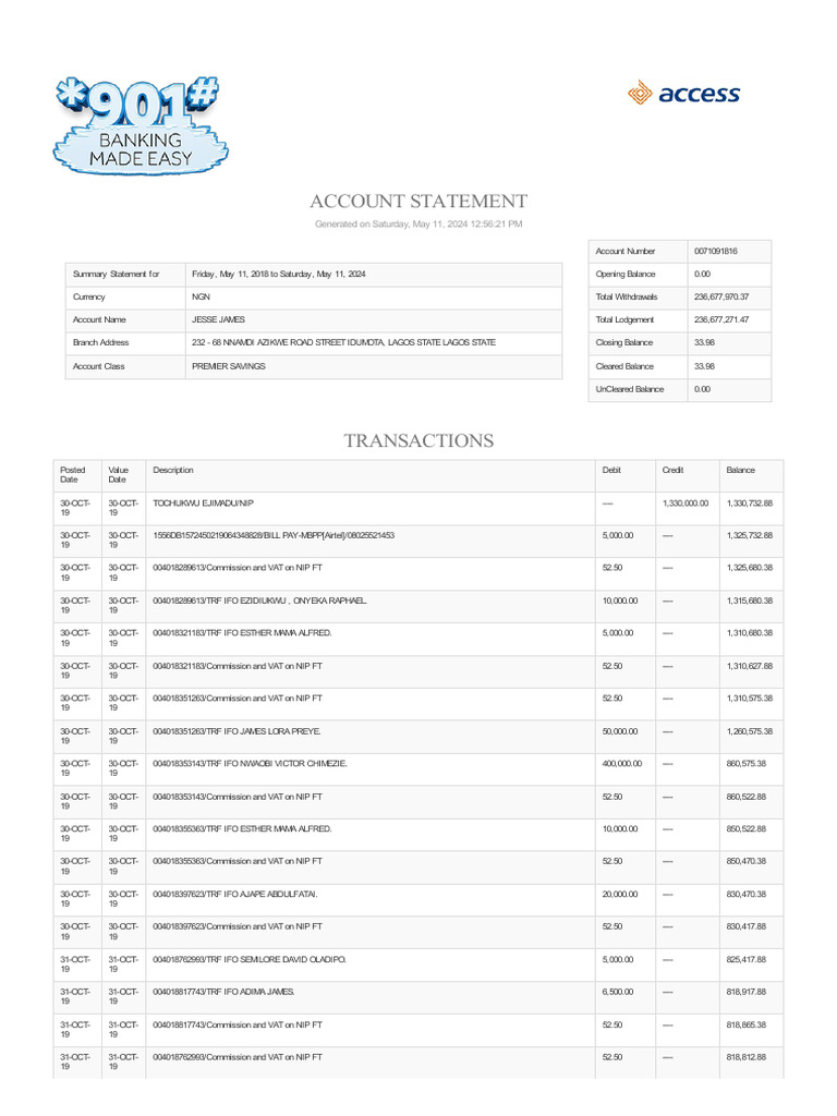 Branch Address 232 - 68 NNAMDI AZIKWE ROAD STREET IDUMOTA, LAGOS STATE LAGOS STATE Closing Balance 33.98