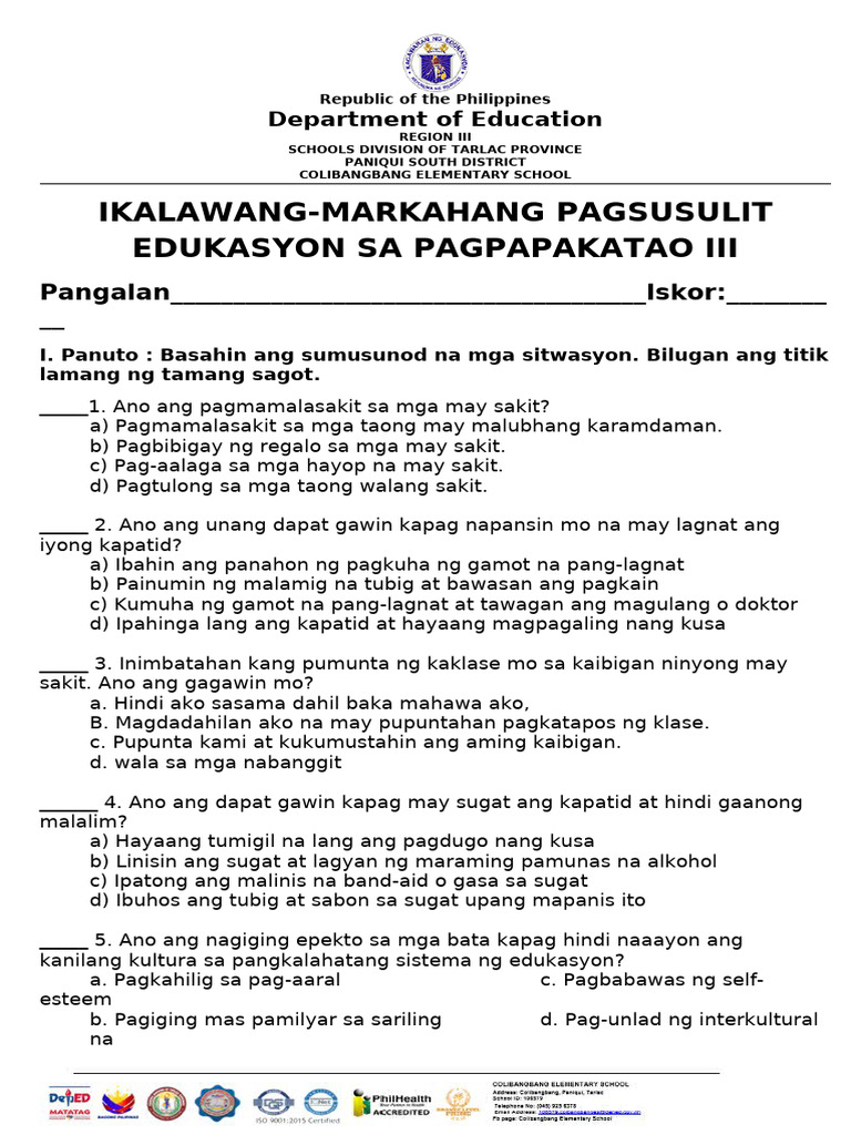 I. Panuto : Basahin ang sumusunod na mga sitwasyon. Bilugan ang titik