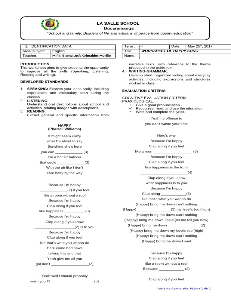 Area/ subject: English Title: WORKSHEET OF HAPPY SONG