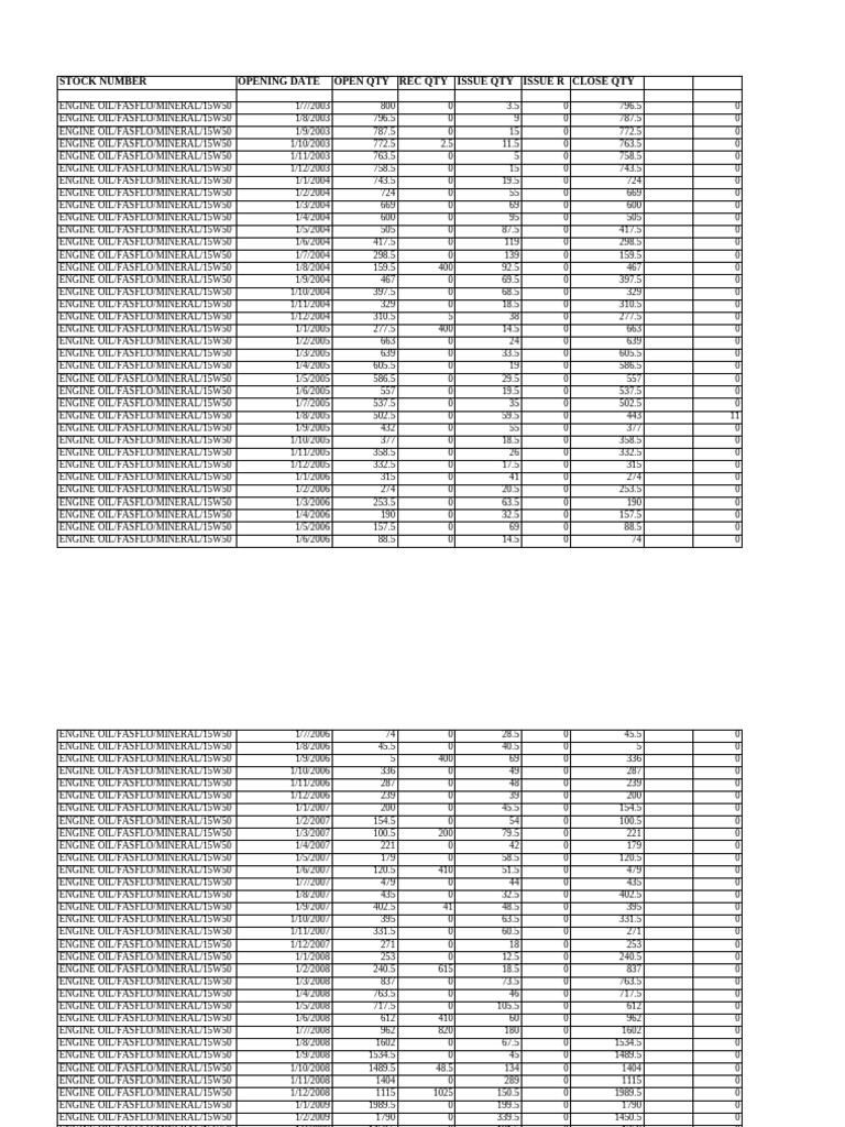 STOCK NUMBER OPENING DATE OPEN QTY REC QTY ISSUE QTY ISSUE R CLOSE QTY