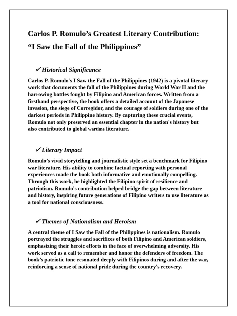 Carlos P. Romulo's I Saw the Fall of the Philippines (1942) is a pivotal literary