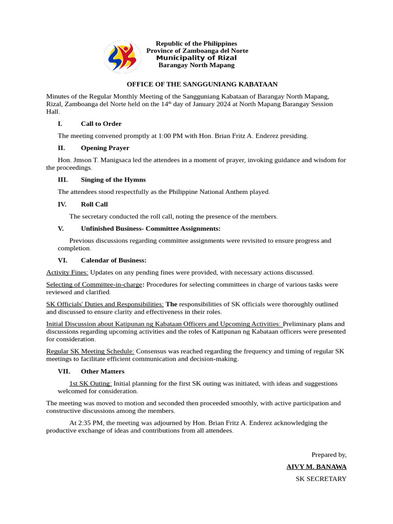 Minutes of the Regular Monthly Meeting of the Sangguniang Kabataan of Barangay North Mapang,
