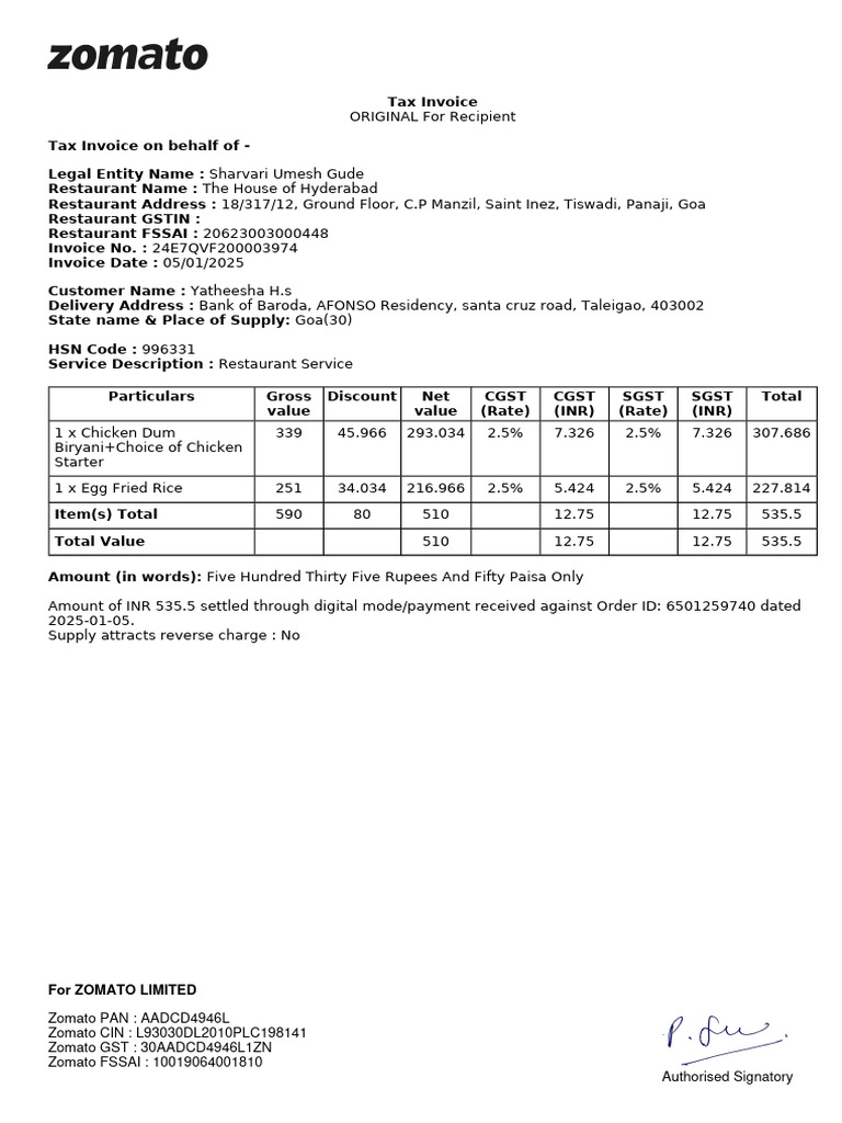 Email ID: order@zomato.com GSTIN: 30AADCD4946L1ZN
