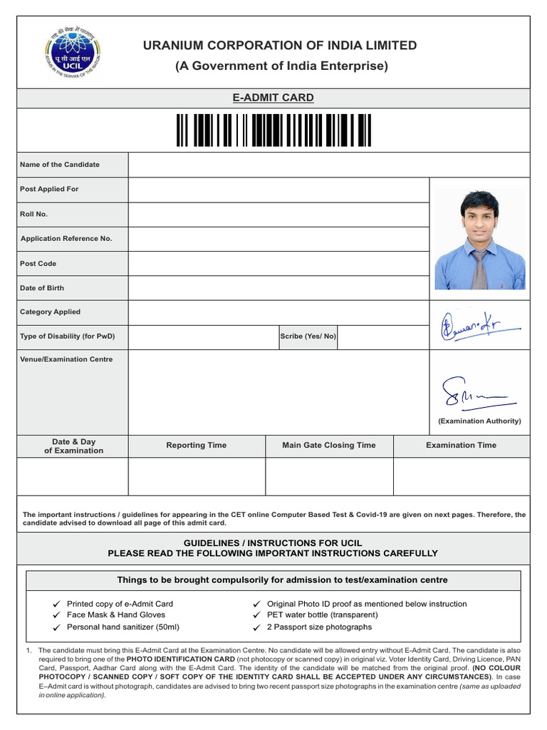 1. The candidate must bring this E-Admit Card at the Examination Centre. No candidate will be allowed entry without E-Admit Card. The candidate is also