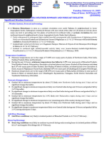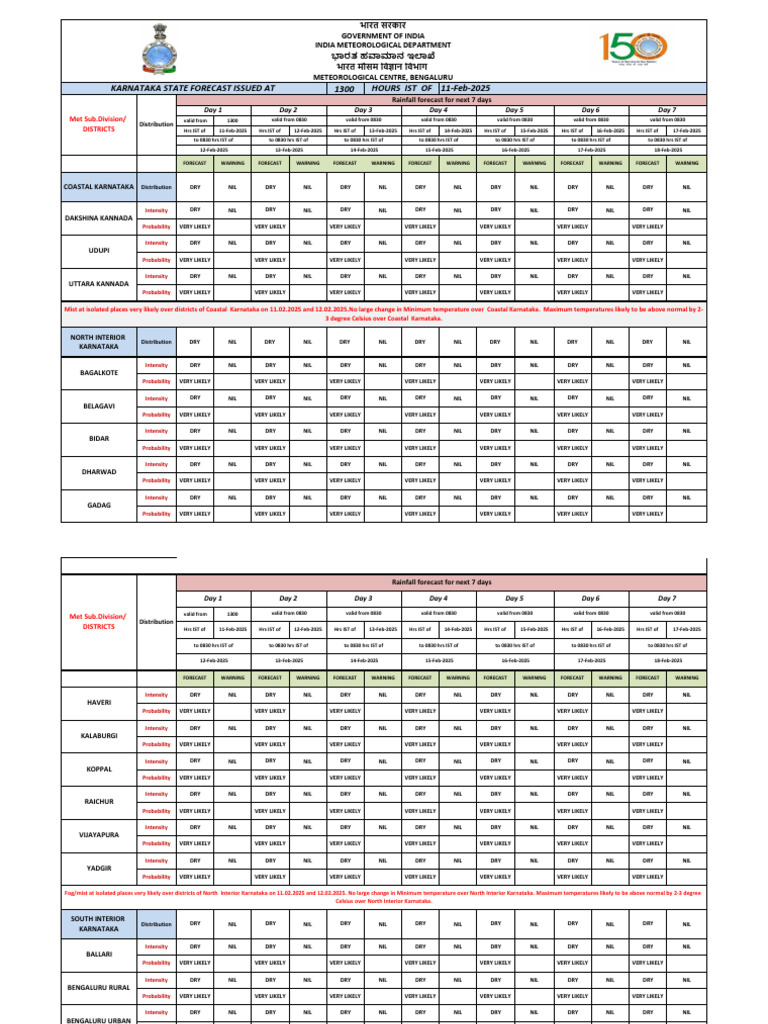 Fog/mist at isolated places very likely over districts of North Interior Karnataka on 11.02.2025 and 12.02.2025. No large change in Minimum temperature over North Interior Karnataka. Maximum temperatures likely to be above normal by 2-3 degree