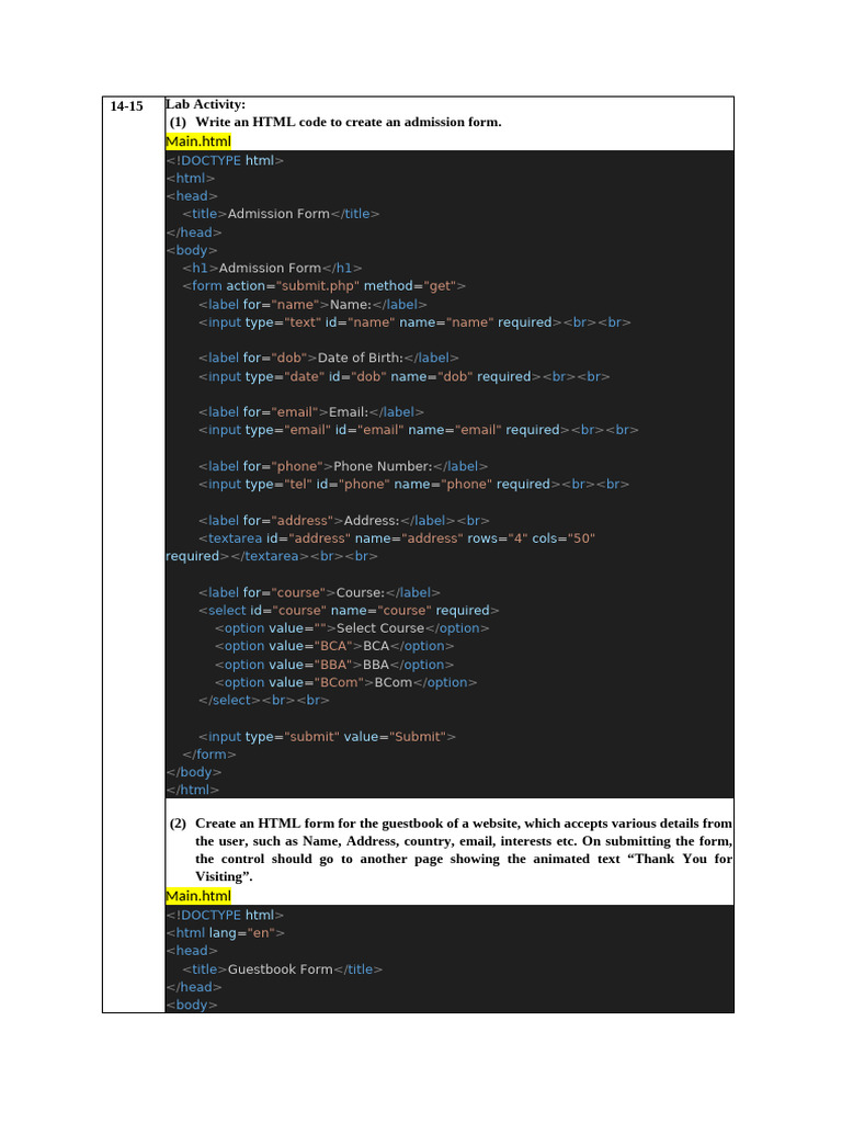 (1) Write an HTML code to create an admission form.