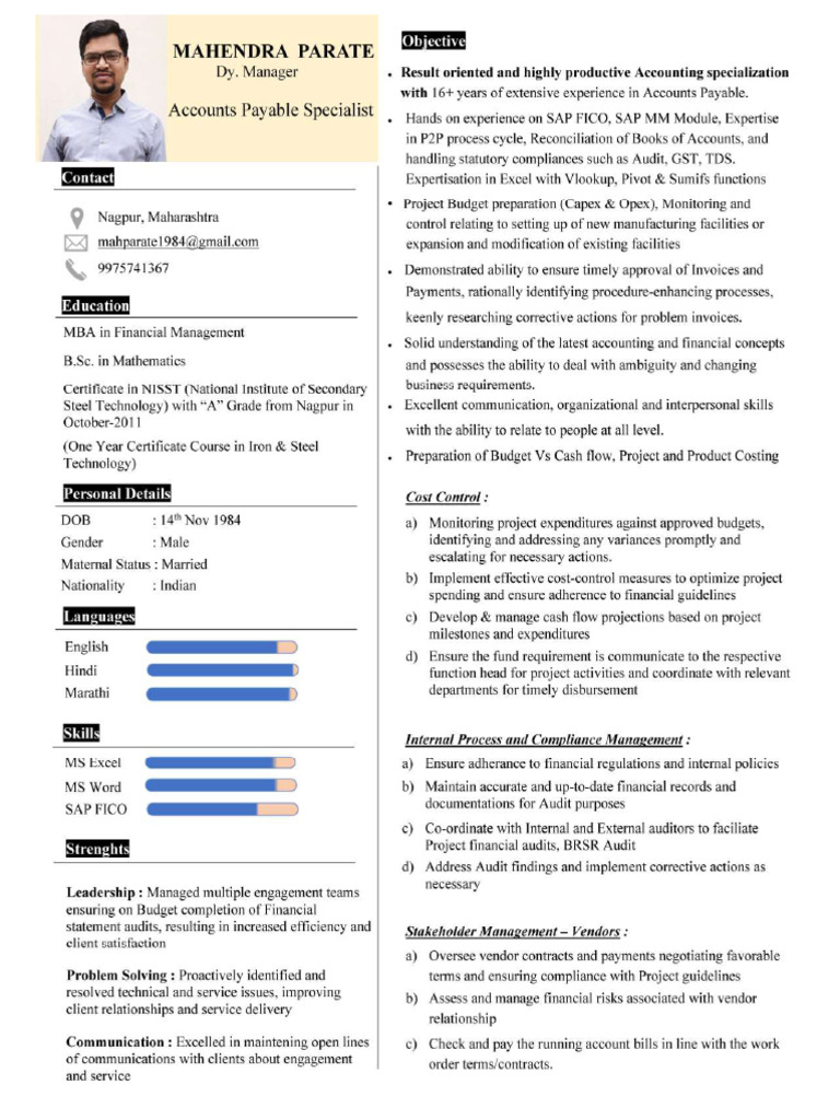 Nationality : Indian b) Implement effective cost-control measures to optimize project