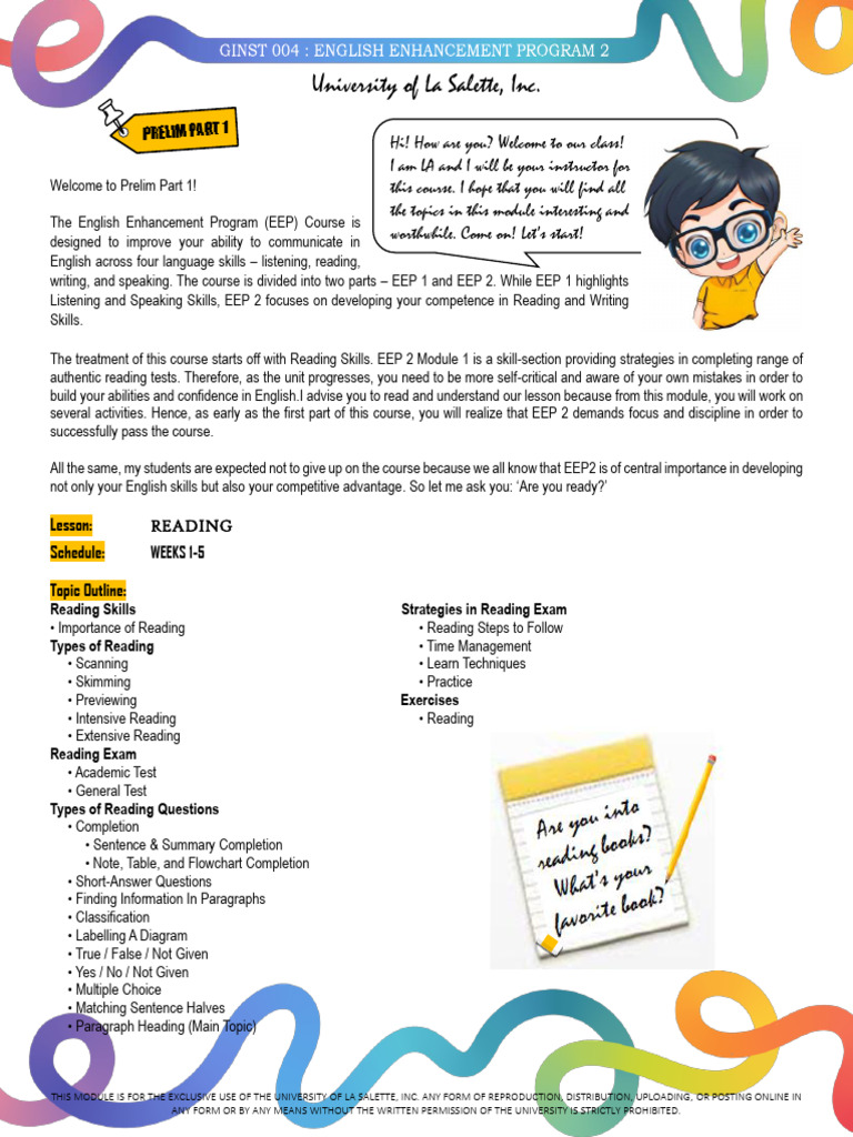 The treatment of this course starts off with Reading Skills. EEP 2 Module 1 is a skill-section providing strategies in completing range of